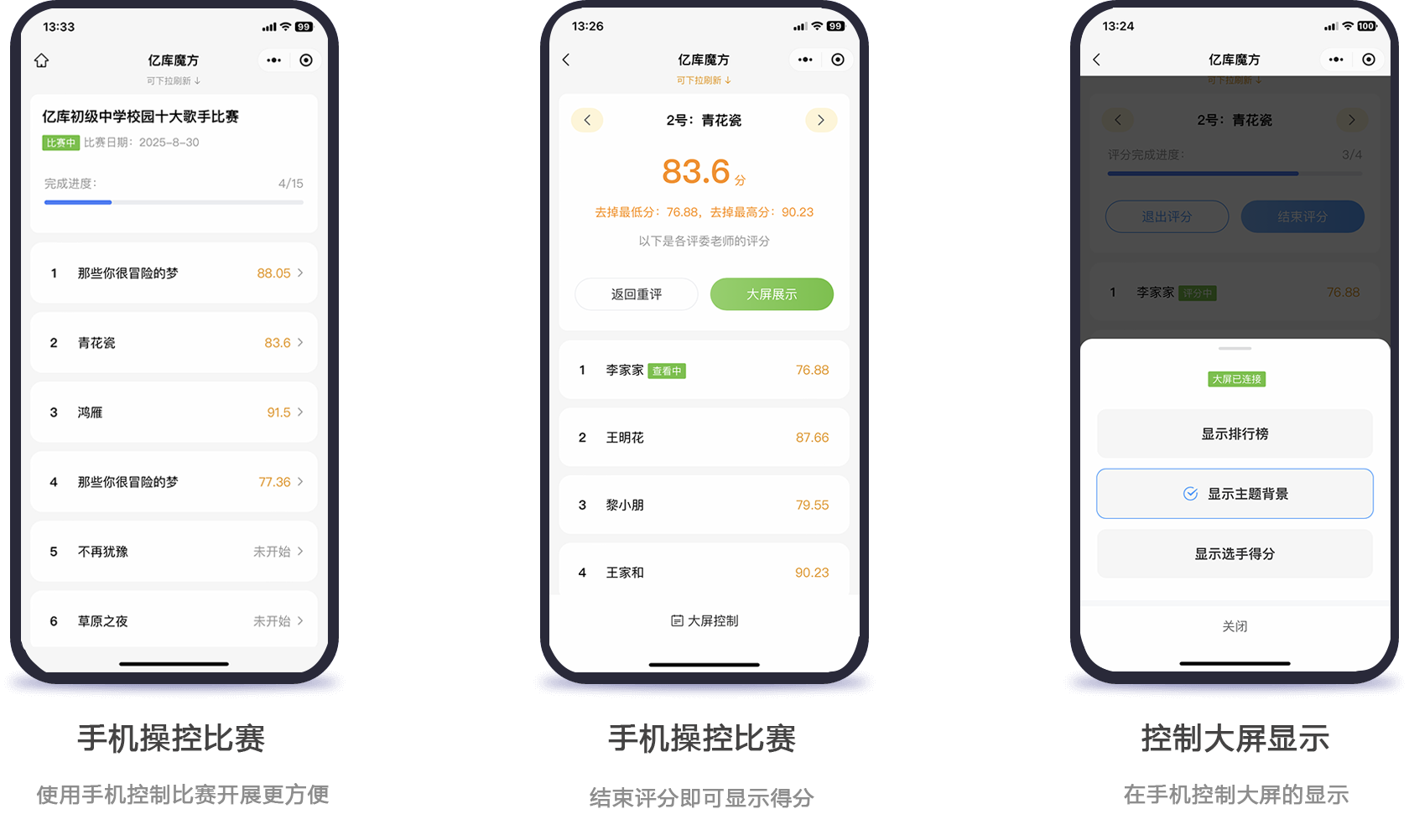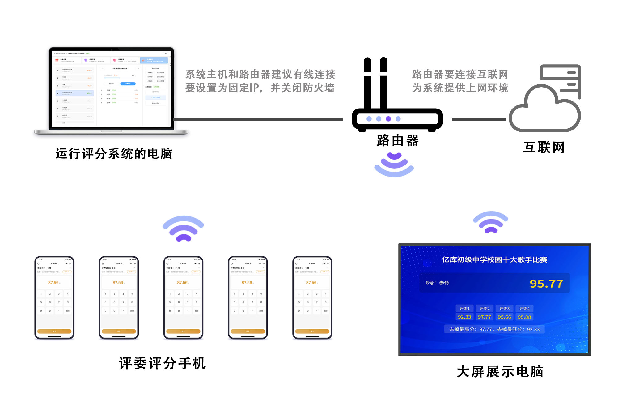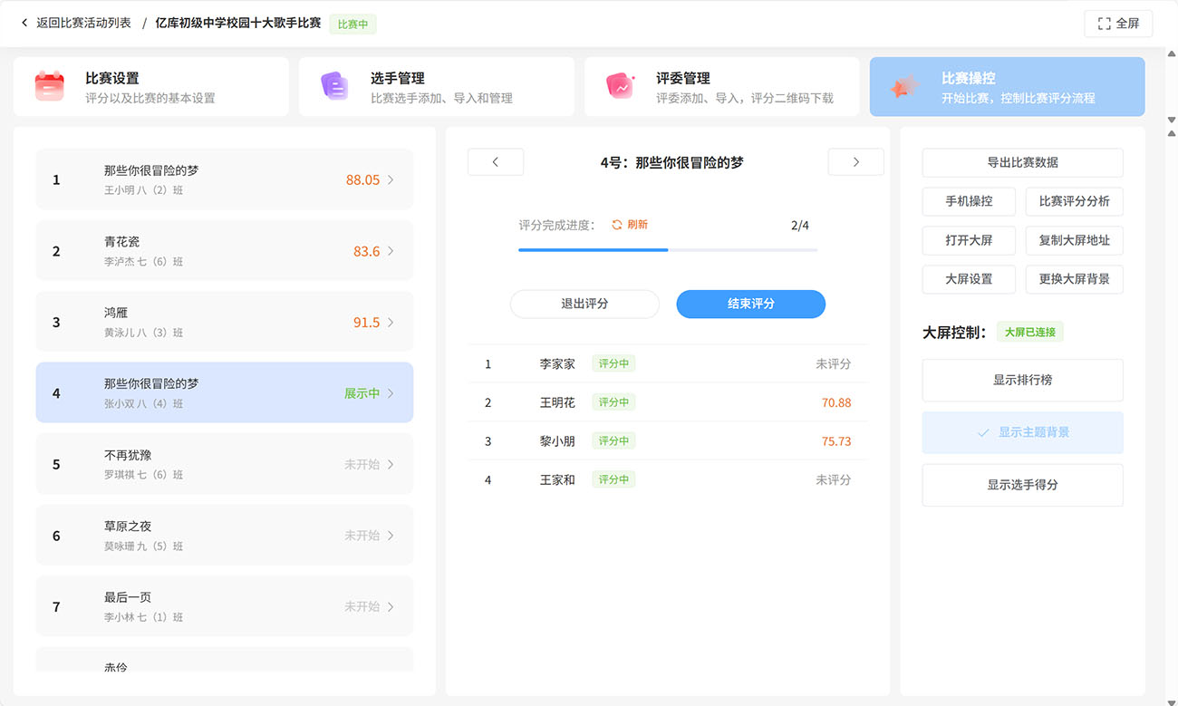 特点:功能和专业版一致,可下载到本地运行,通过局域网wifi连接评分和大屏展示,不授外网络影响,可控性极高、延时极低,更稳定、更可靠。